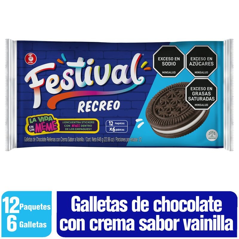 Según la información disponible, el contenido nutricional puede variar ligeramente dependiendo del tamaño de la porción y la presentación específica del producto. La siguiente información se basa en una porción estándar de 4 galletas (36 g) de Festival Recreo de Noel, según Fitia Colombia: