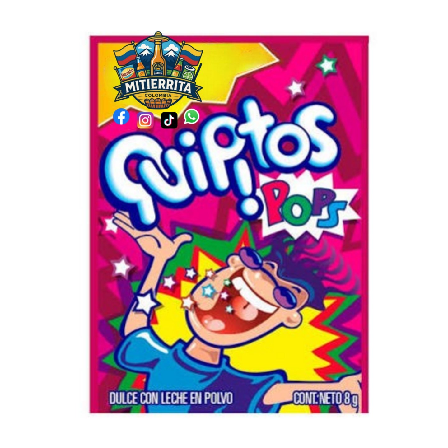 Los Quipitos en presentación de 8 gramos son un popular dulce colombiano en polvo con “chispitas explosivas” (popping candy). El producto, fabricado por Quala, es conocido por la divertida sensación de estallido que produce en la boca al consumirlo.